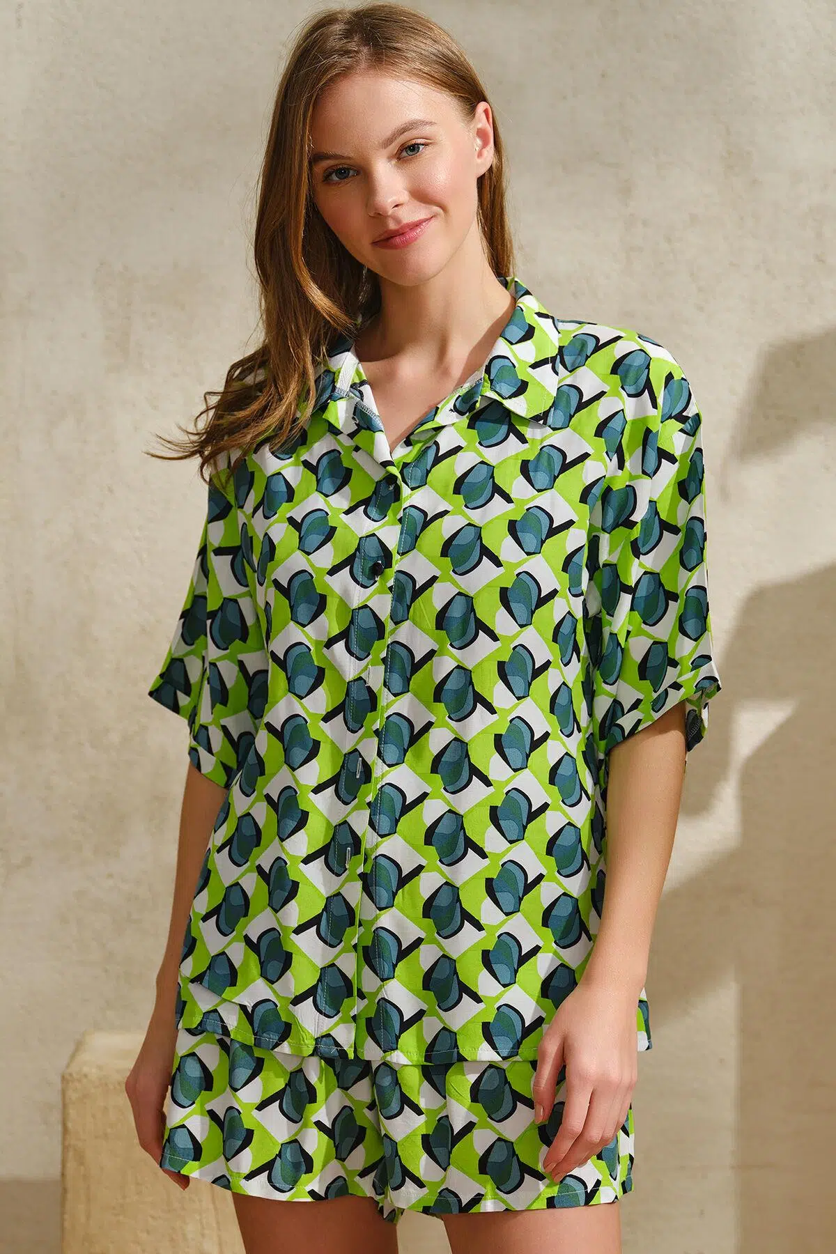 Anıl 5741 Kadın Dokuma Viskon Önden Düğmeli Yarım Kollu Gömlek ve Yandan Cepli Şort Pijama Takım