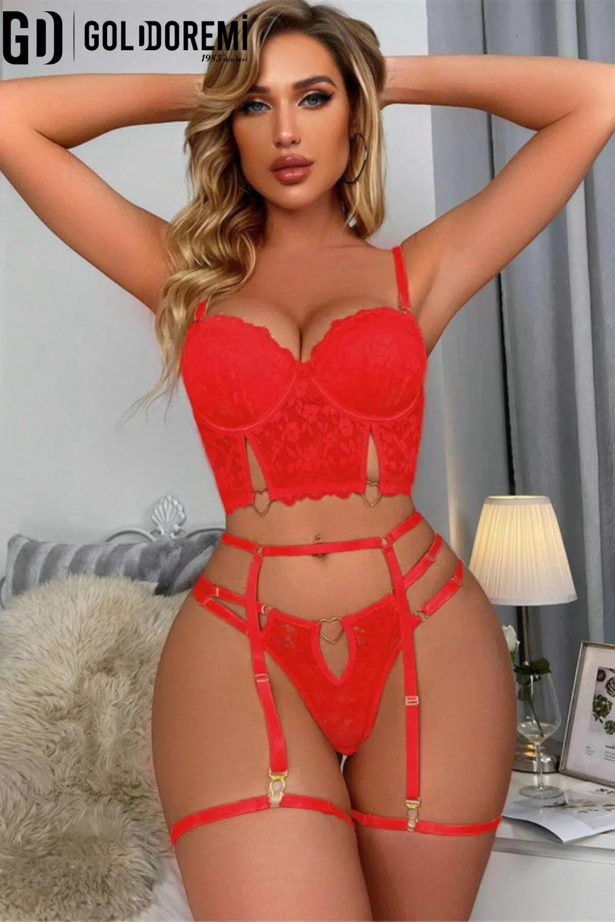 Gd Goldoremi Kadın Kırmızı Dantel Detaylı Büstiyerli Demir Kalp Fantezi Takım