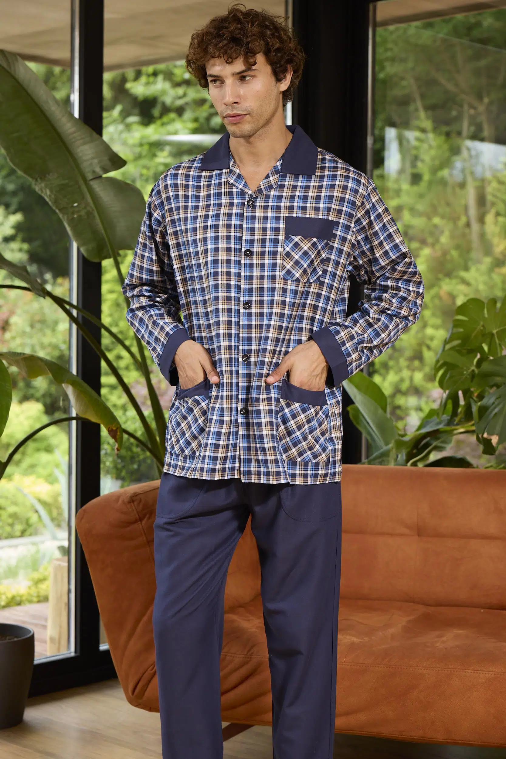 Kly 4037 Erkek Apaj Yaka Önden Düğmeli Uzun Kol Pijama Takım