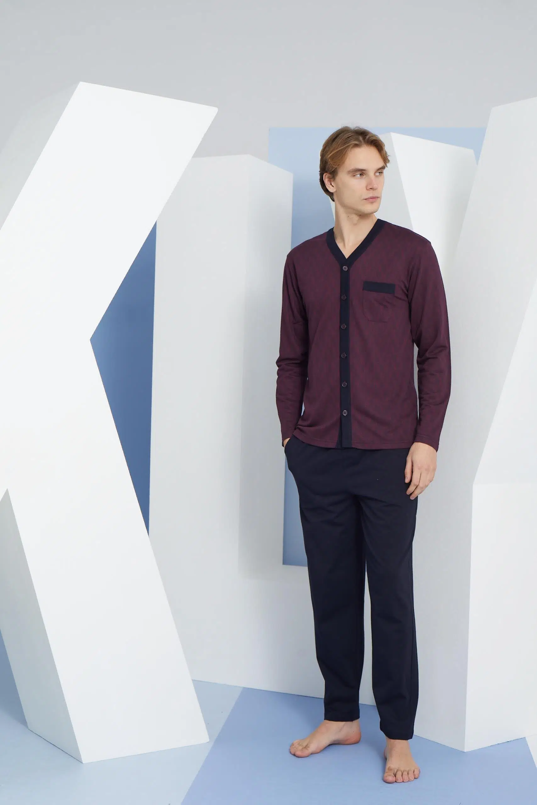 Kly 9252 Erkek V Yaka 4 Mevsim Boydan Düğmeli Uzun Kollu Pijama Takım