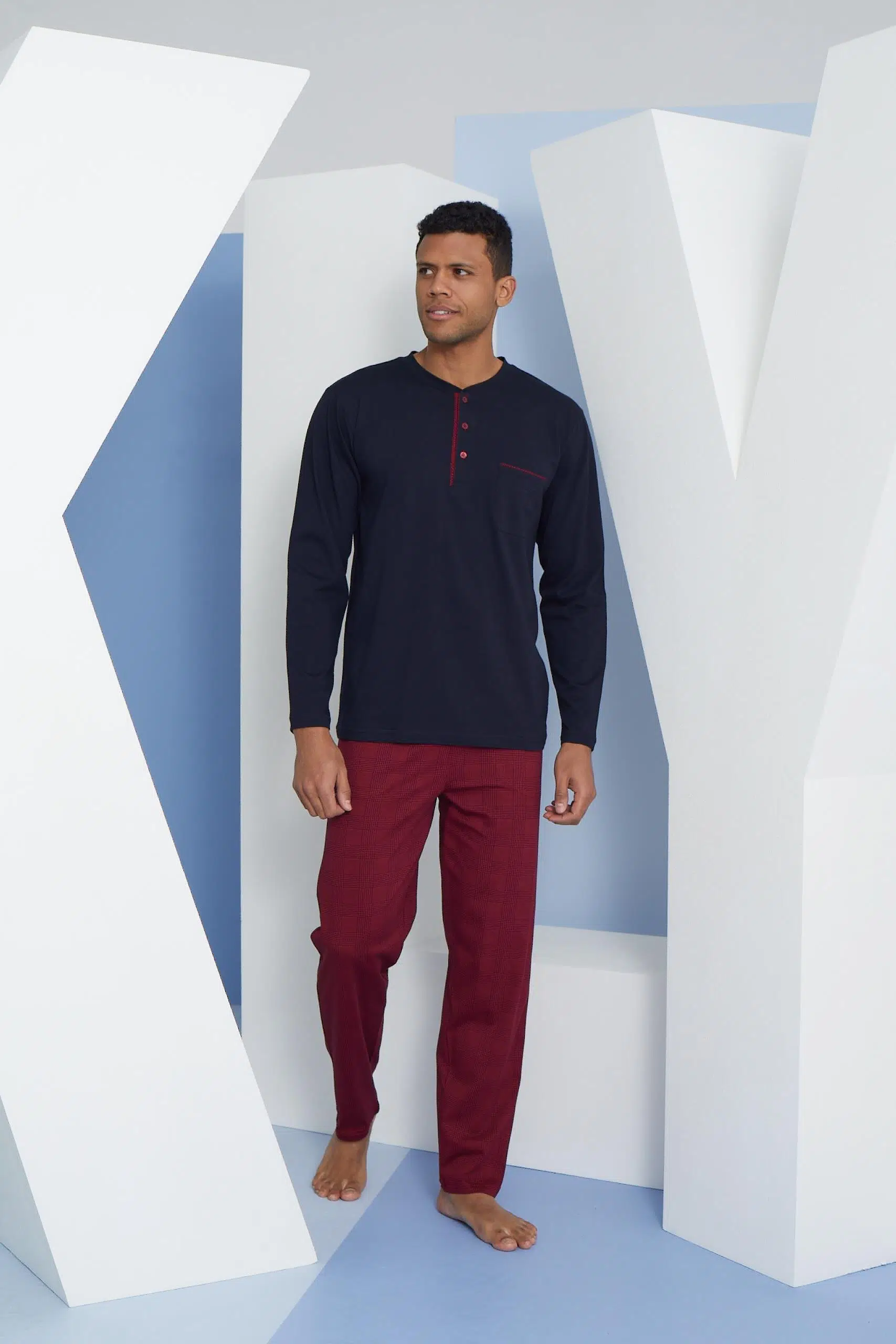Kly 9258 Erkek Diğmeli Midi Yaka Uzun Kol Pijama Takım