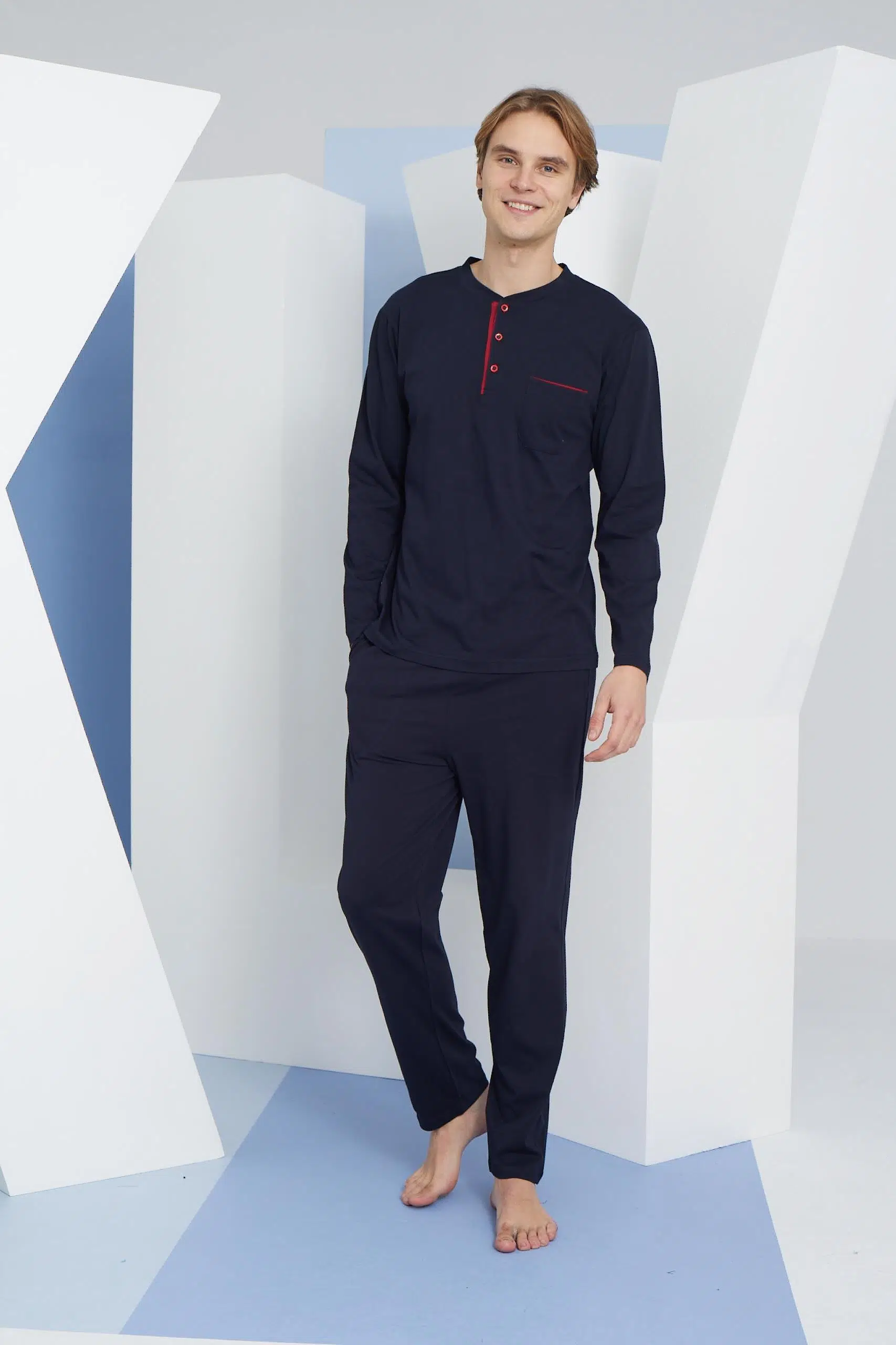 Kly Erkek Ekstra Büyük Beden %100 Pamuklu Düğmeli Yaka Mevsimlik Uzun Kollu Pijama Takım