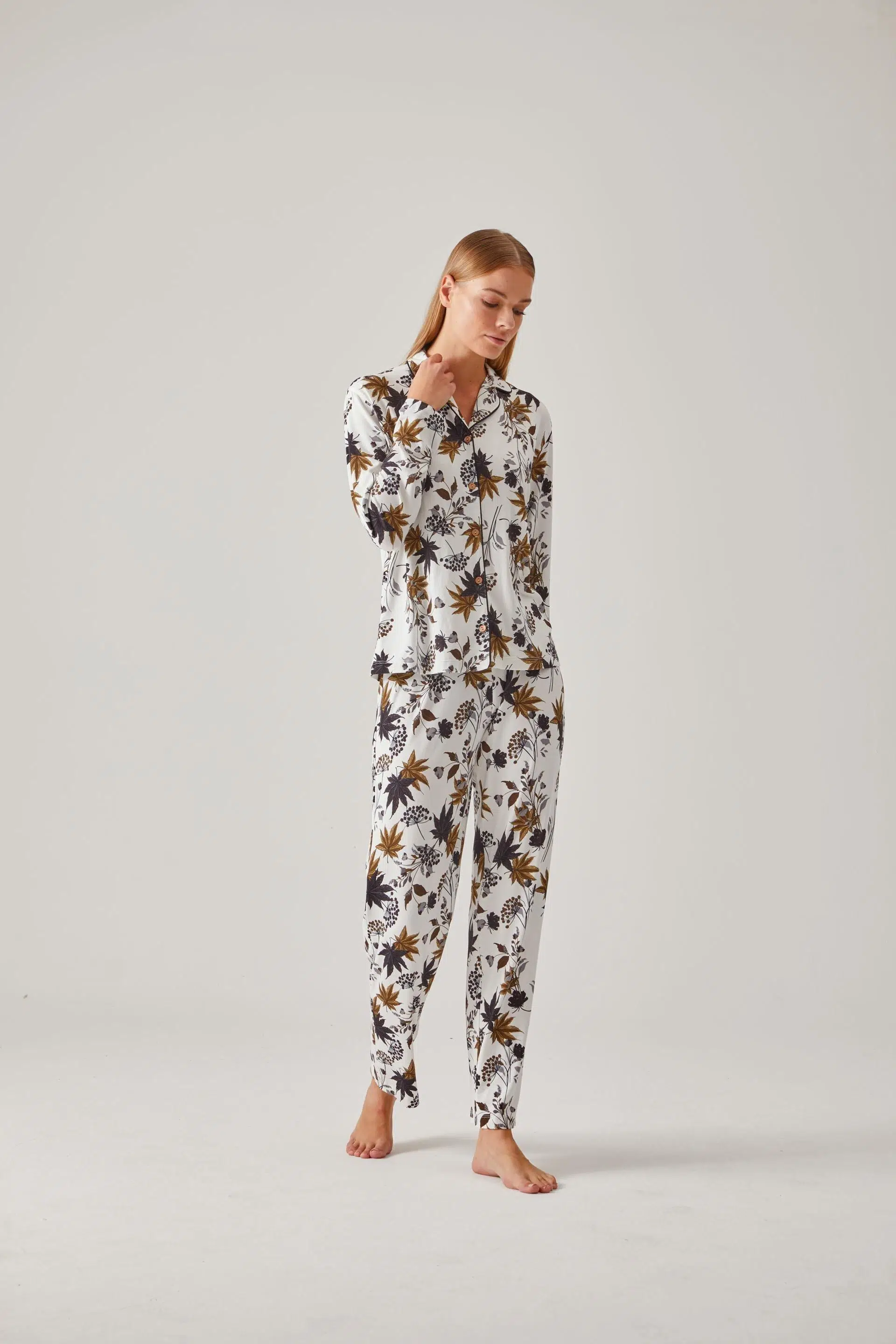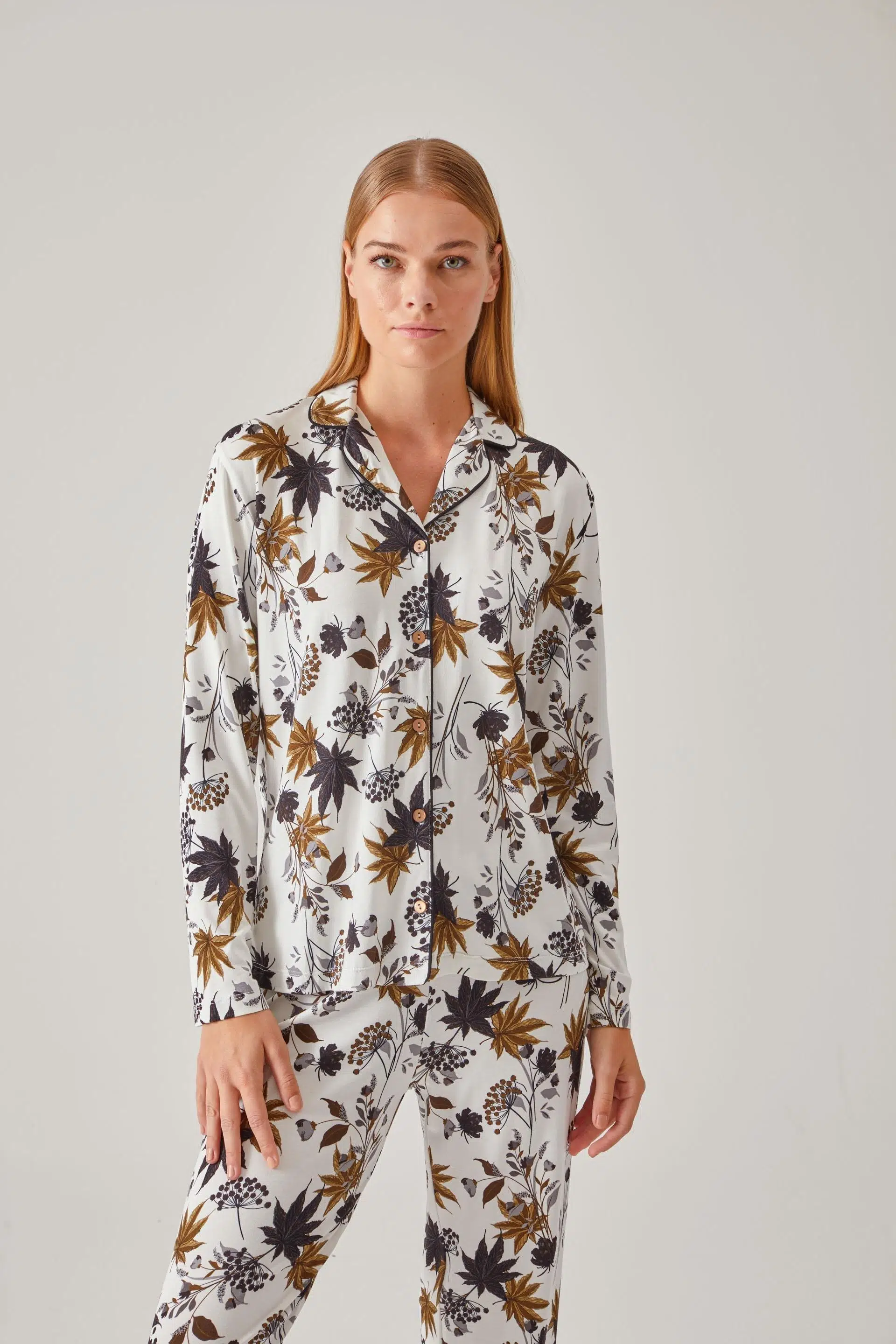Pamuk Pamuk 24032 Kadın Ceviz Yeşil Çiçek Desen Önden Düğmeli Pijama Takımı