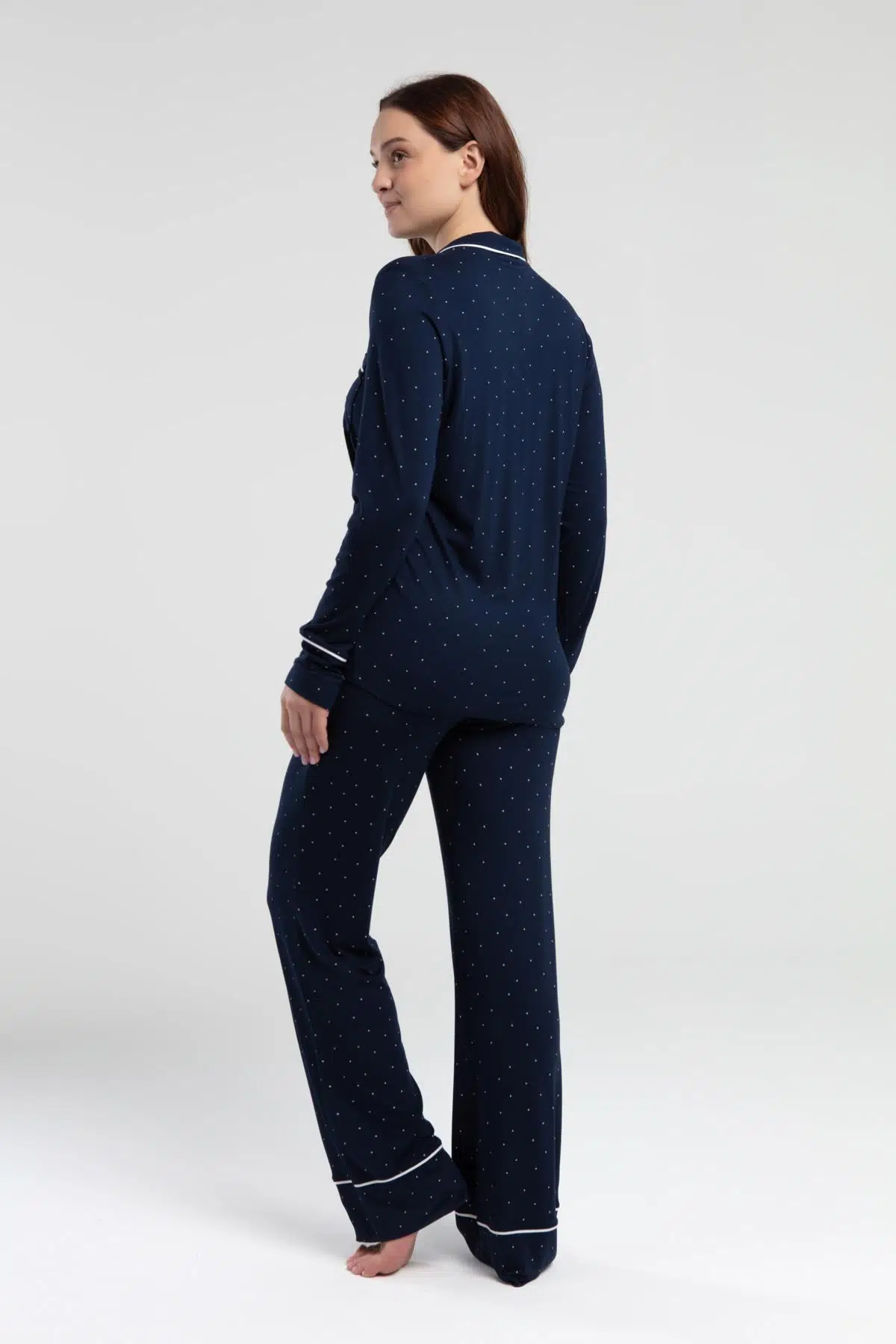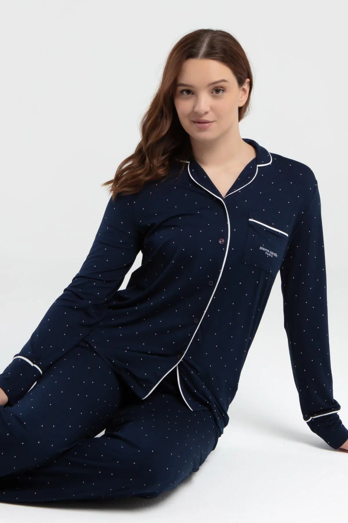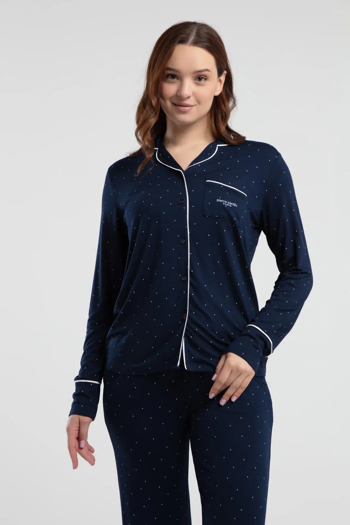 Pierre Cardin 8986 Kadın Lacivert Gömlek Yaka Önden Düğmeli Cepli Pijama Takım