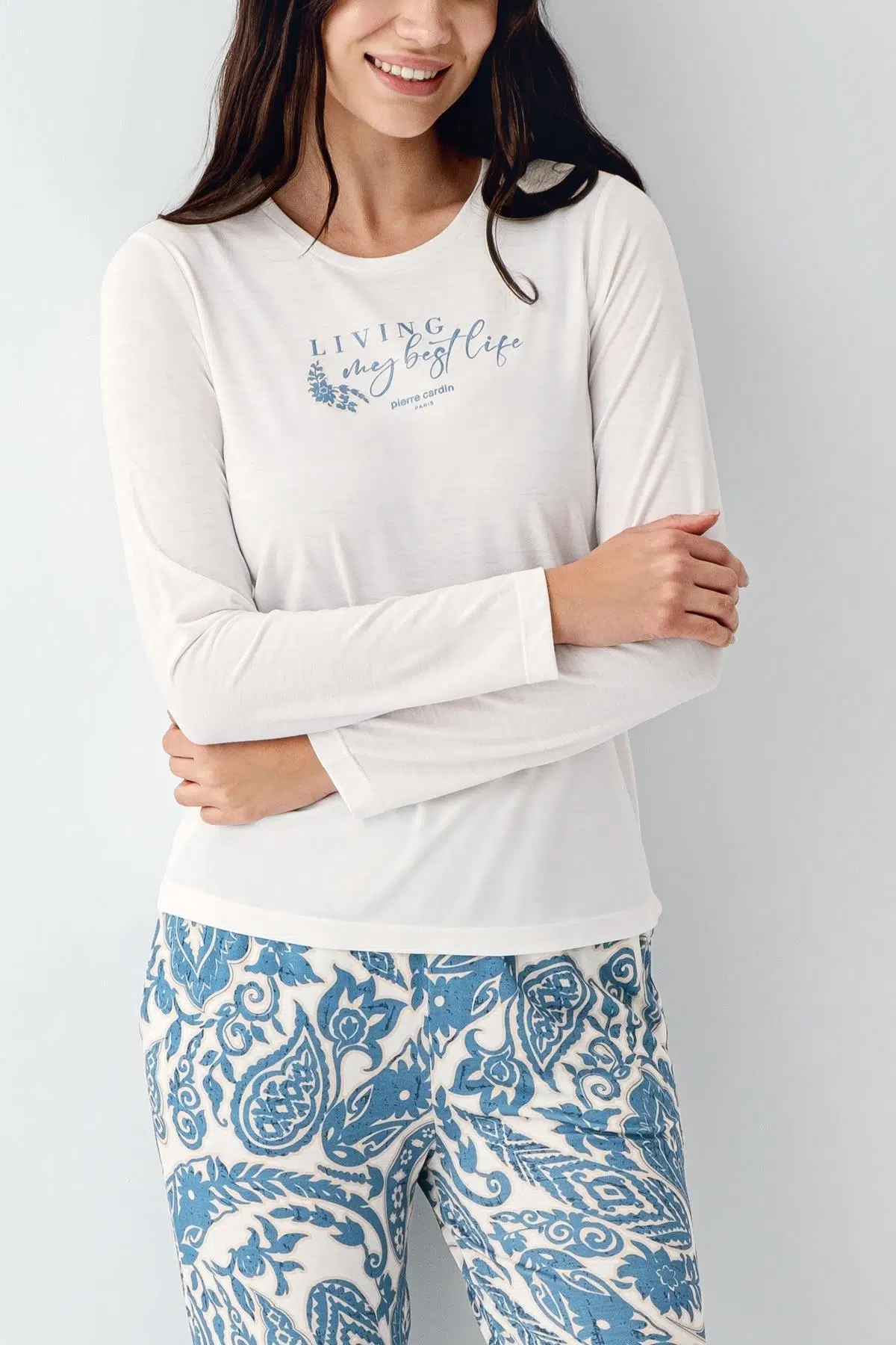 Pierre Cardin Kadın Lıvıng My Best Life Modal Pamuklu Krem Uzun Kollu Desenli Pijama Takım