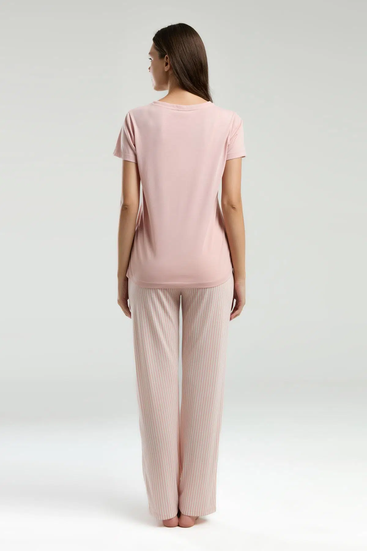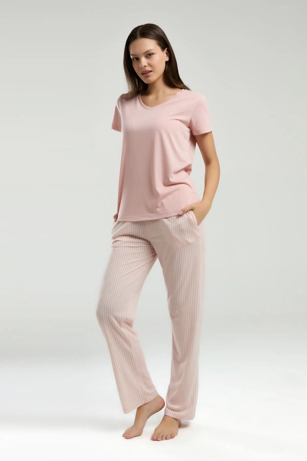 Pierre Cardin 9011 Kadın V Yaka Kısa Kol Çizgili Pijama Takım