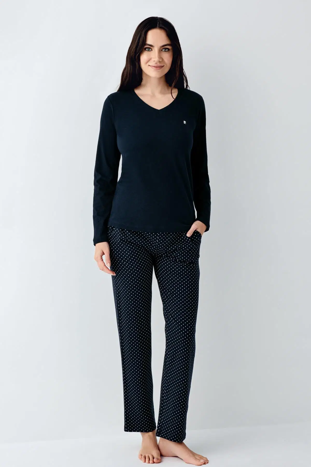 Pierre Cardin Paris Kadın Lacivert Puantiyeli V Yaka Uzun Kollu Pijama Takımı