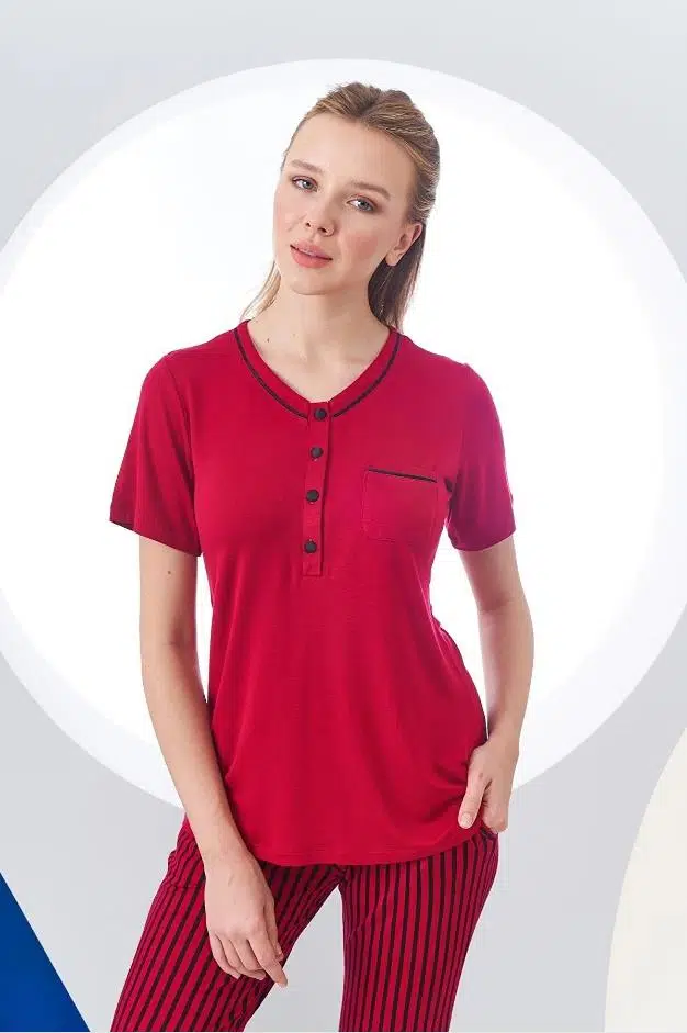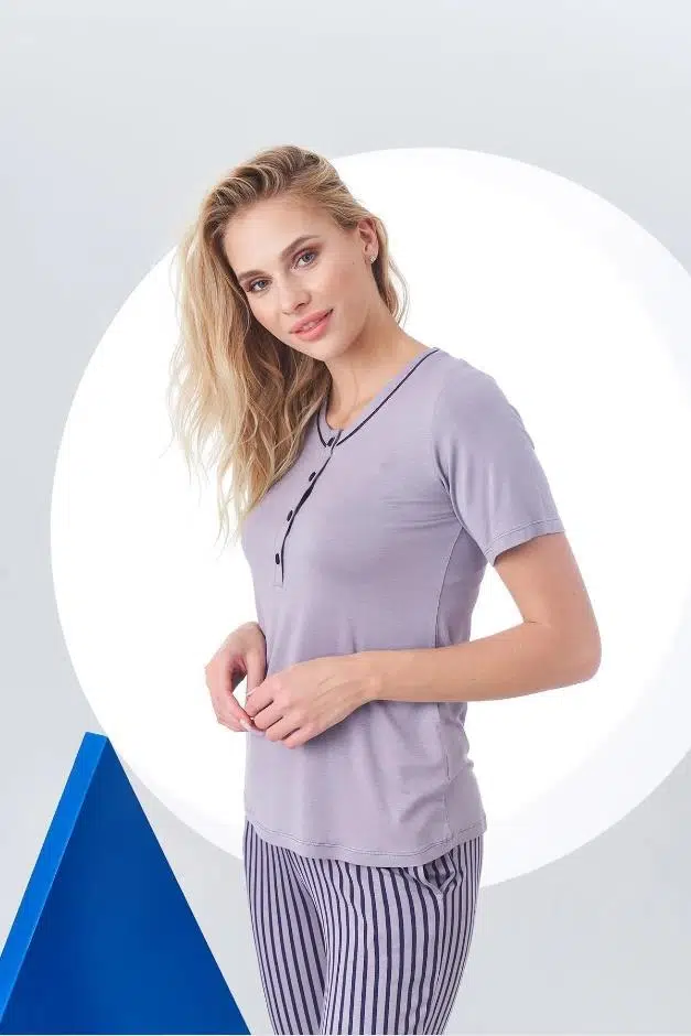 Pjs 24157 Kadın Çizgili Patlı Kısa Kol Pijama Takım