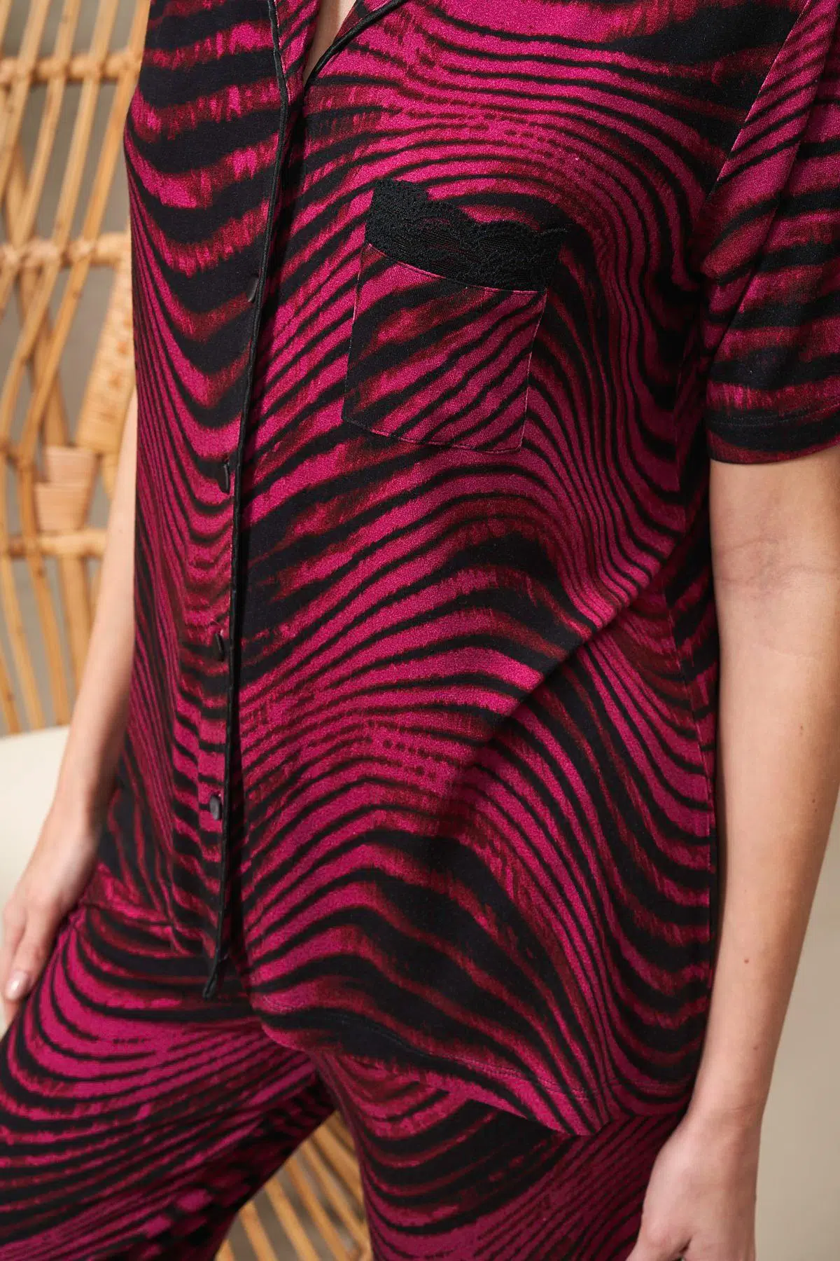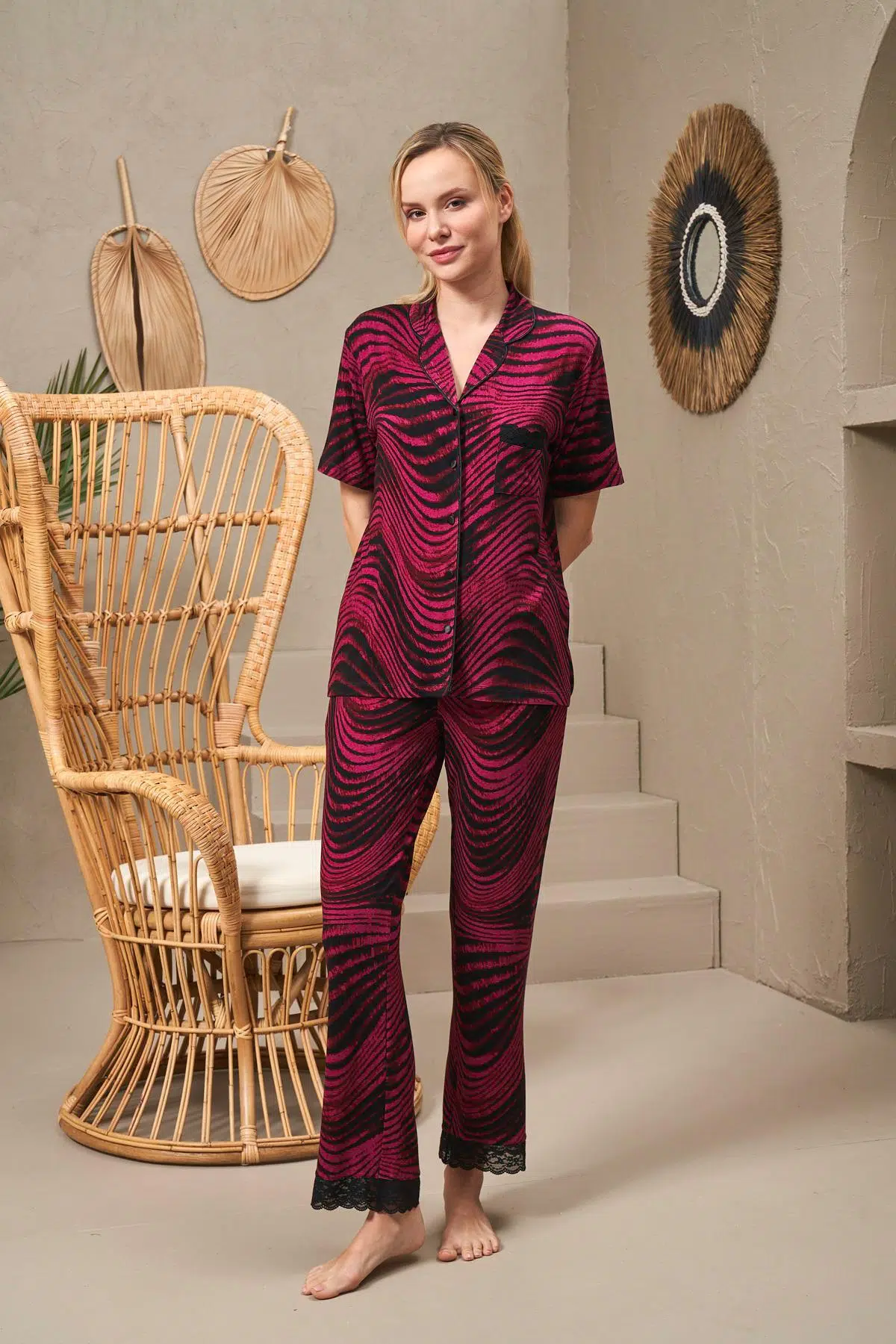 Pjs 25140 Kadın Yakalı Düğmeli Desenli Kısa Kollu Pijama Takım