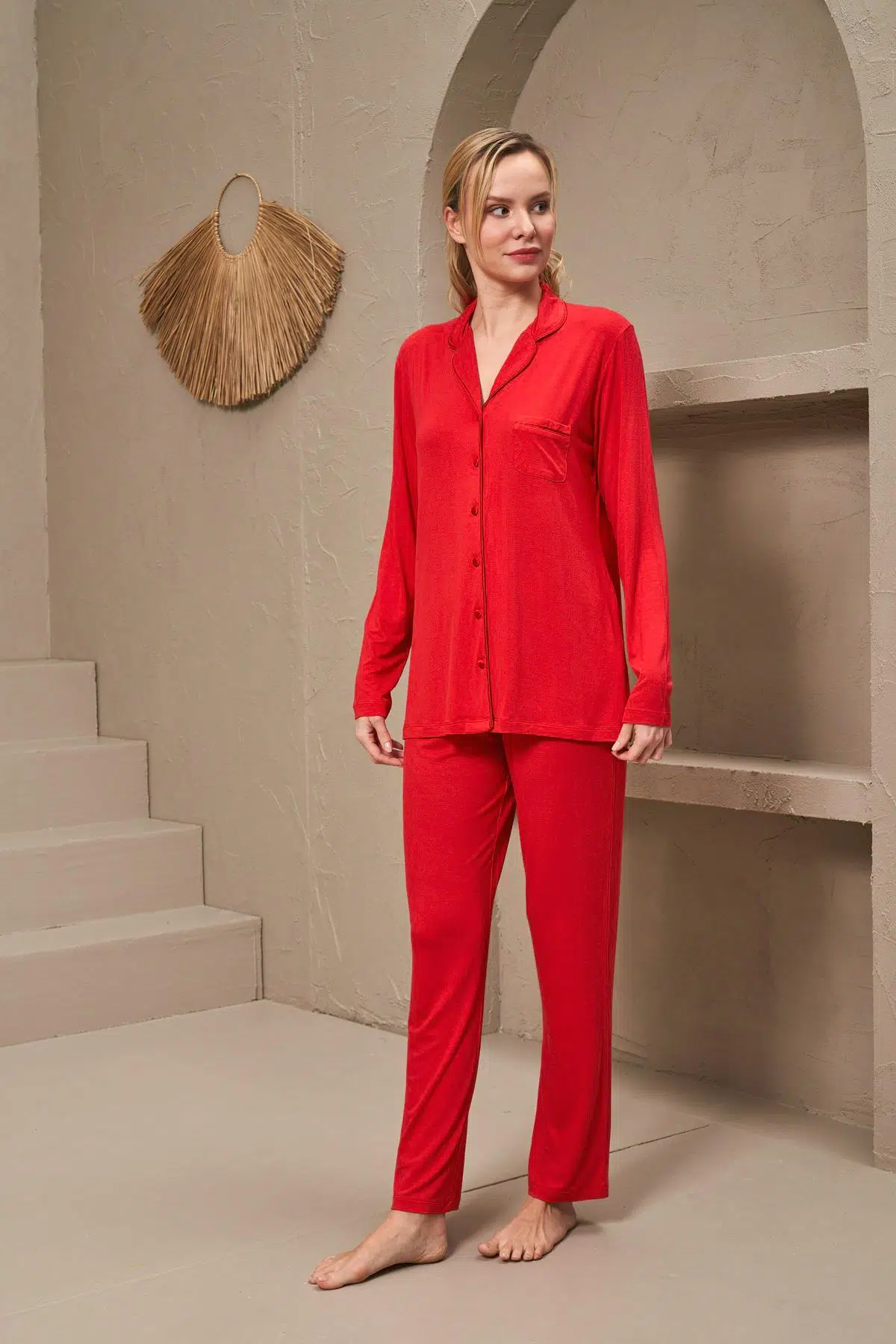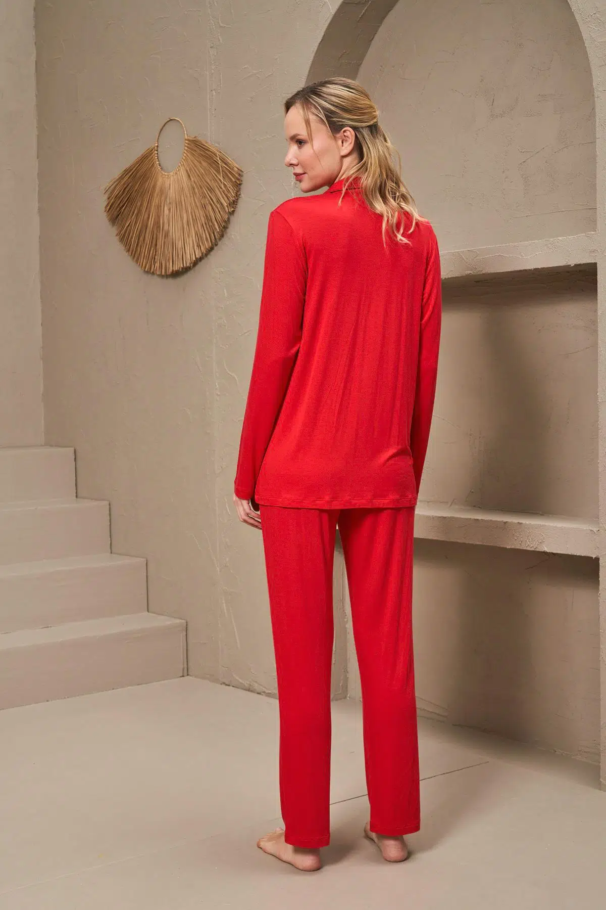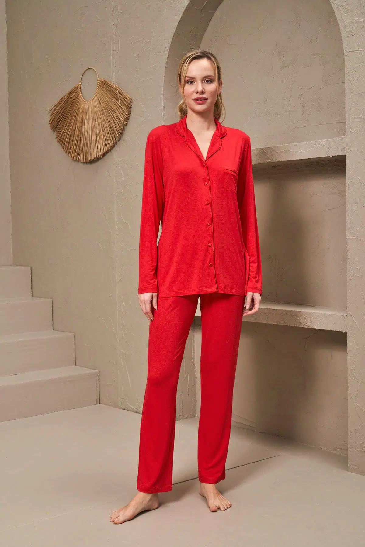 Pjs 25167 Kadın Yakalı Düğmeli Uzun Kollu Kırmızı Pijama Takım