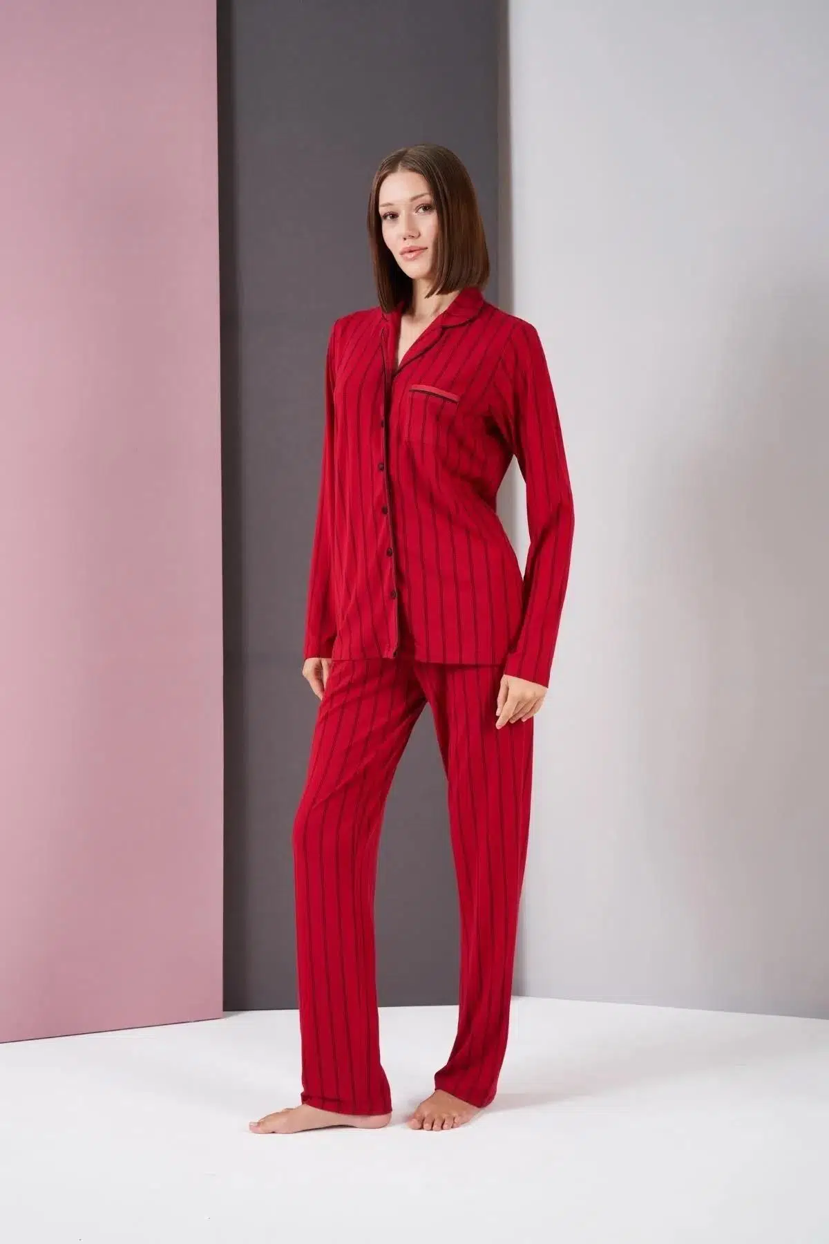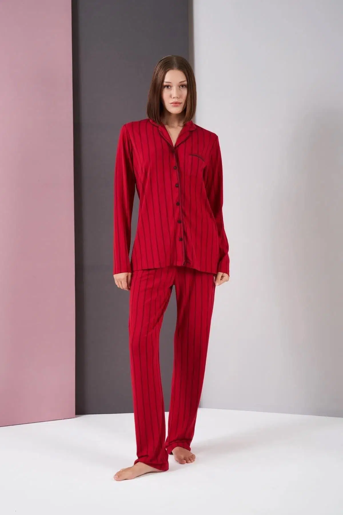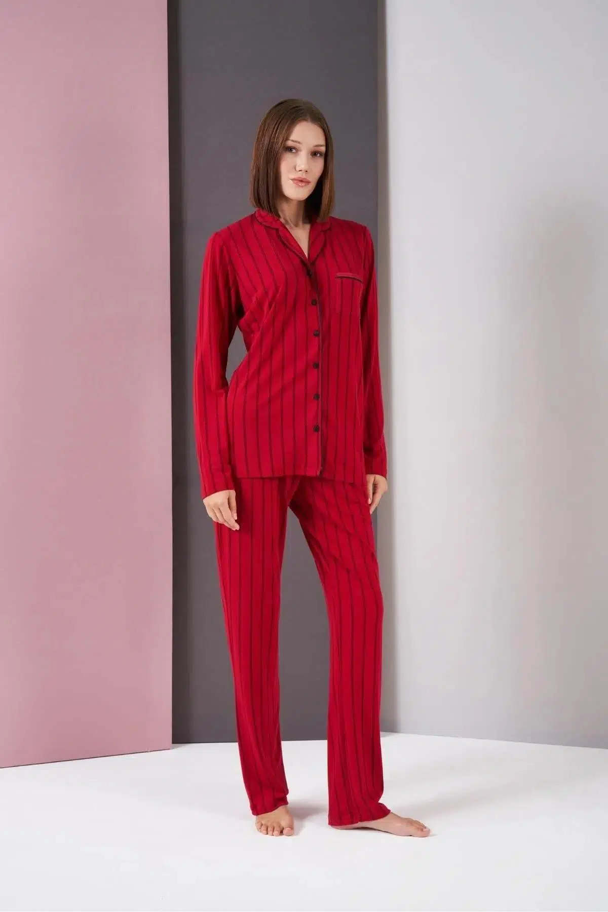 Pjs 26003 Kadın Boydan Patlı Düğmeli Balık Sırtı Çizgili Uzun Kol Pijama Takımı