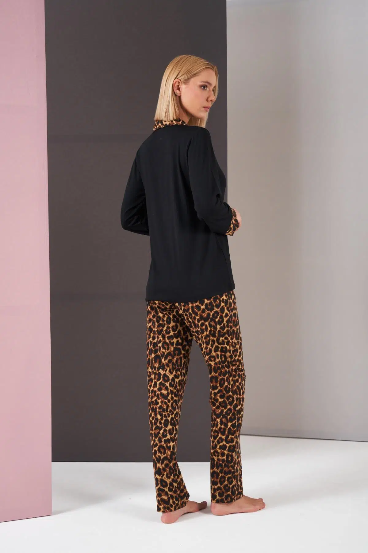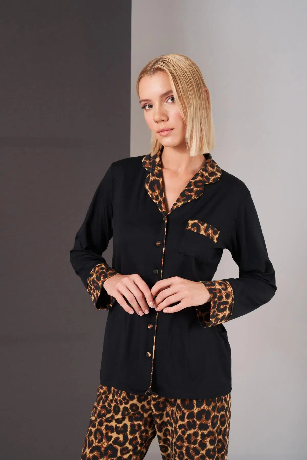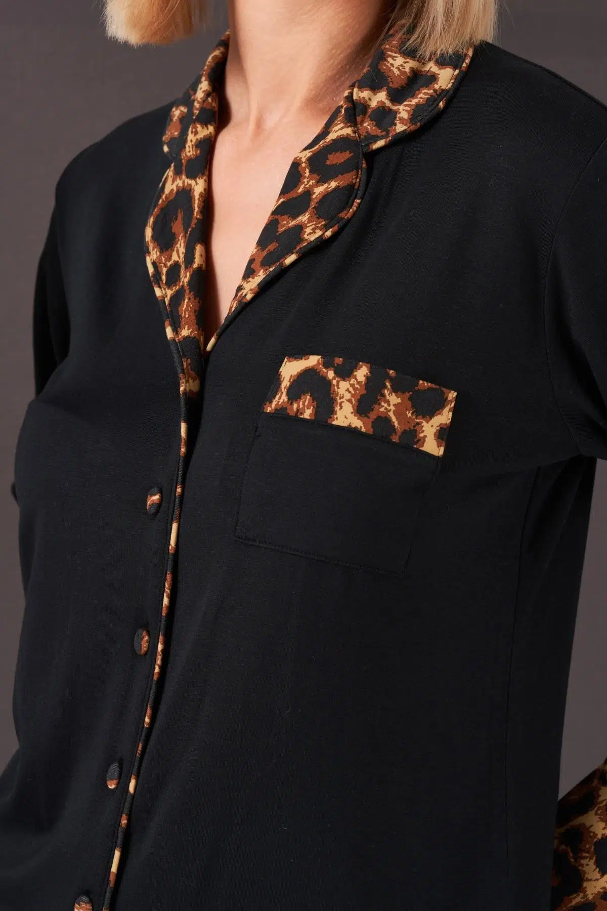 Pjs 26006 Kadın Patlı Boydan Düğmeli Leopar Desenli Uzun Kollu Pijama Takım