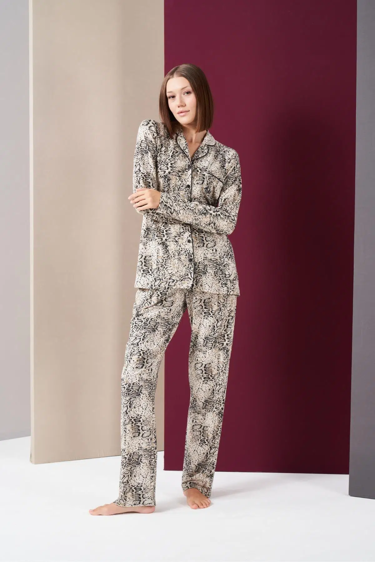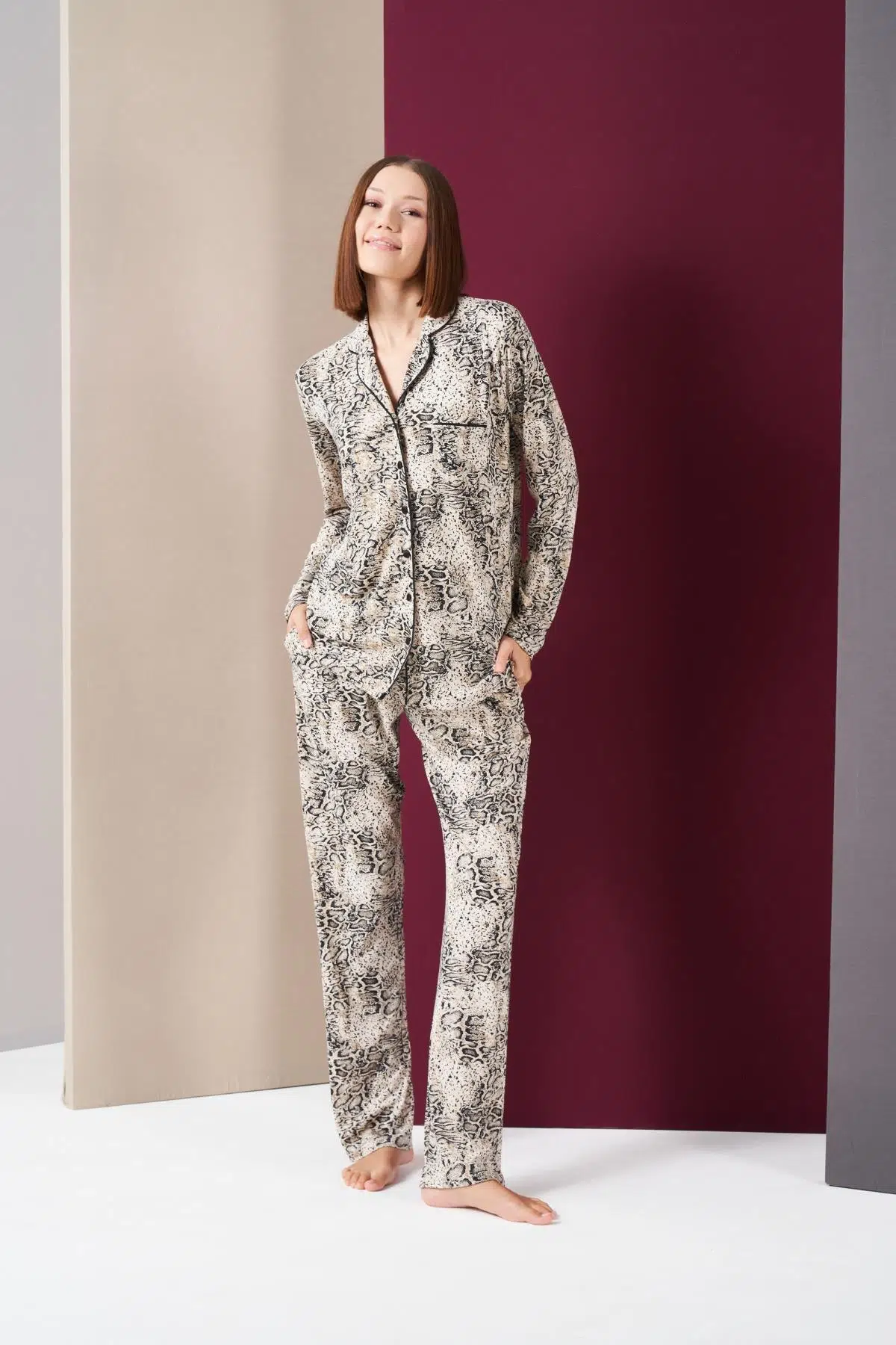 Pjs 26021 Kadın Önden Düğmeli Patlı Leopar Desenli Uzun Kollu Pijama Takım