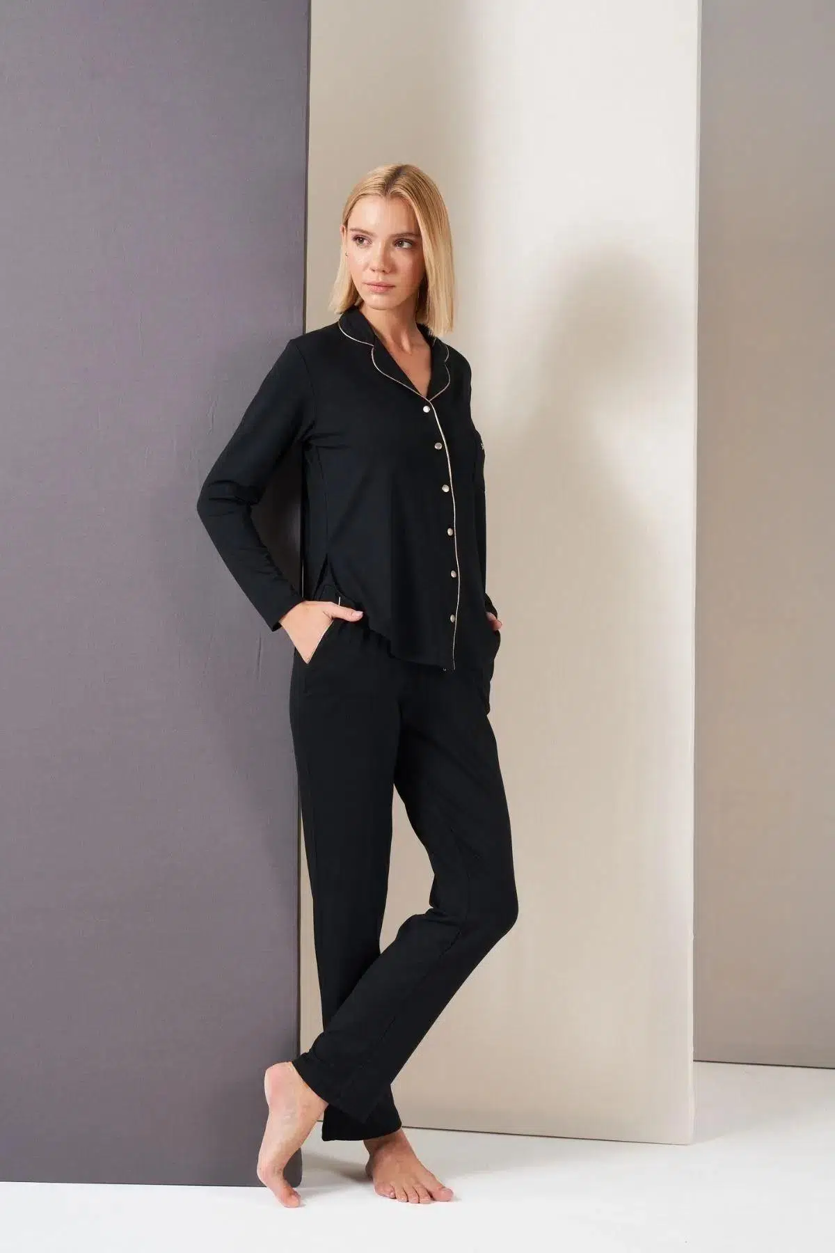 Pjs 26035 Gorgeous Kadın Düğmeli Biyeli Cepli Uzun Kol Pijama Takım