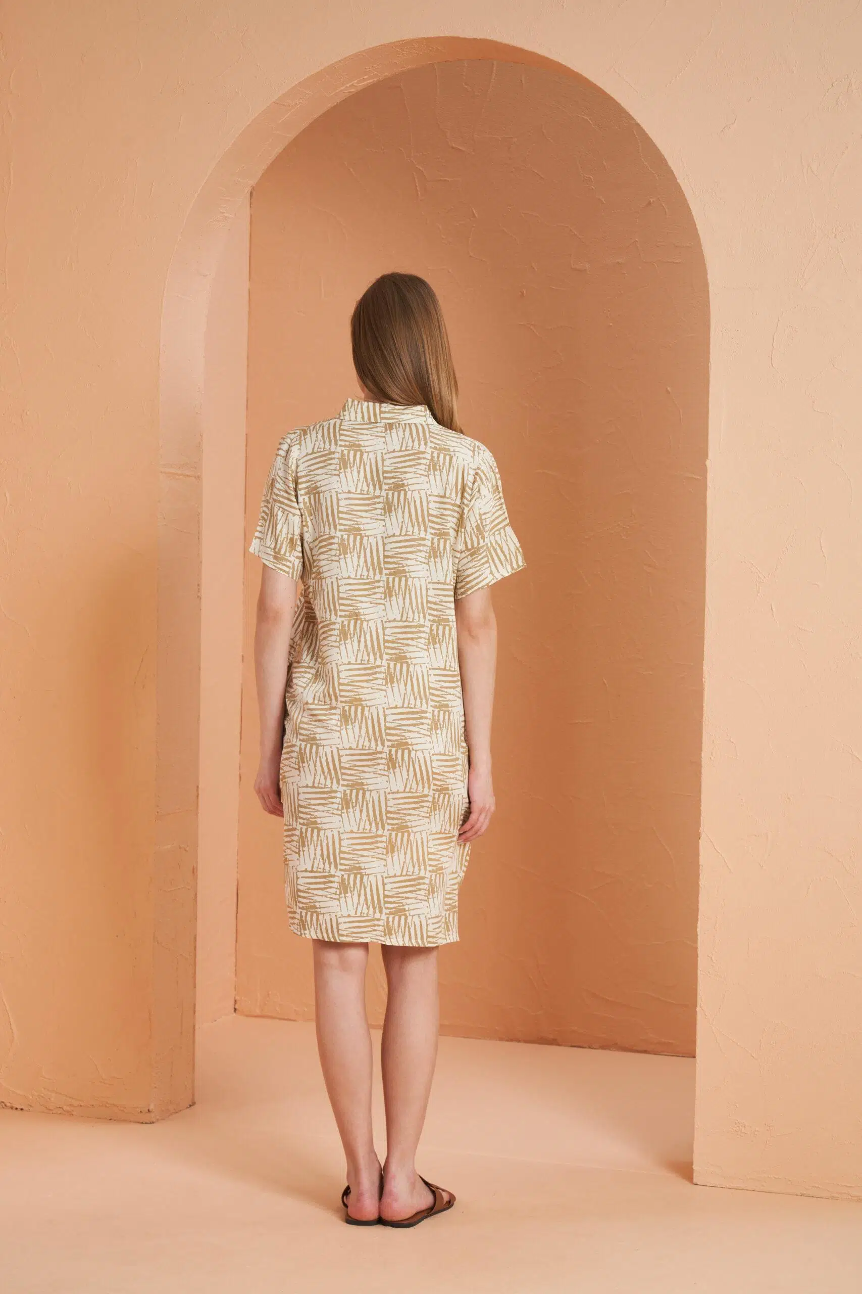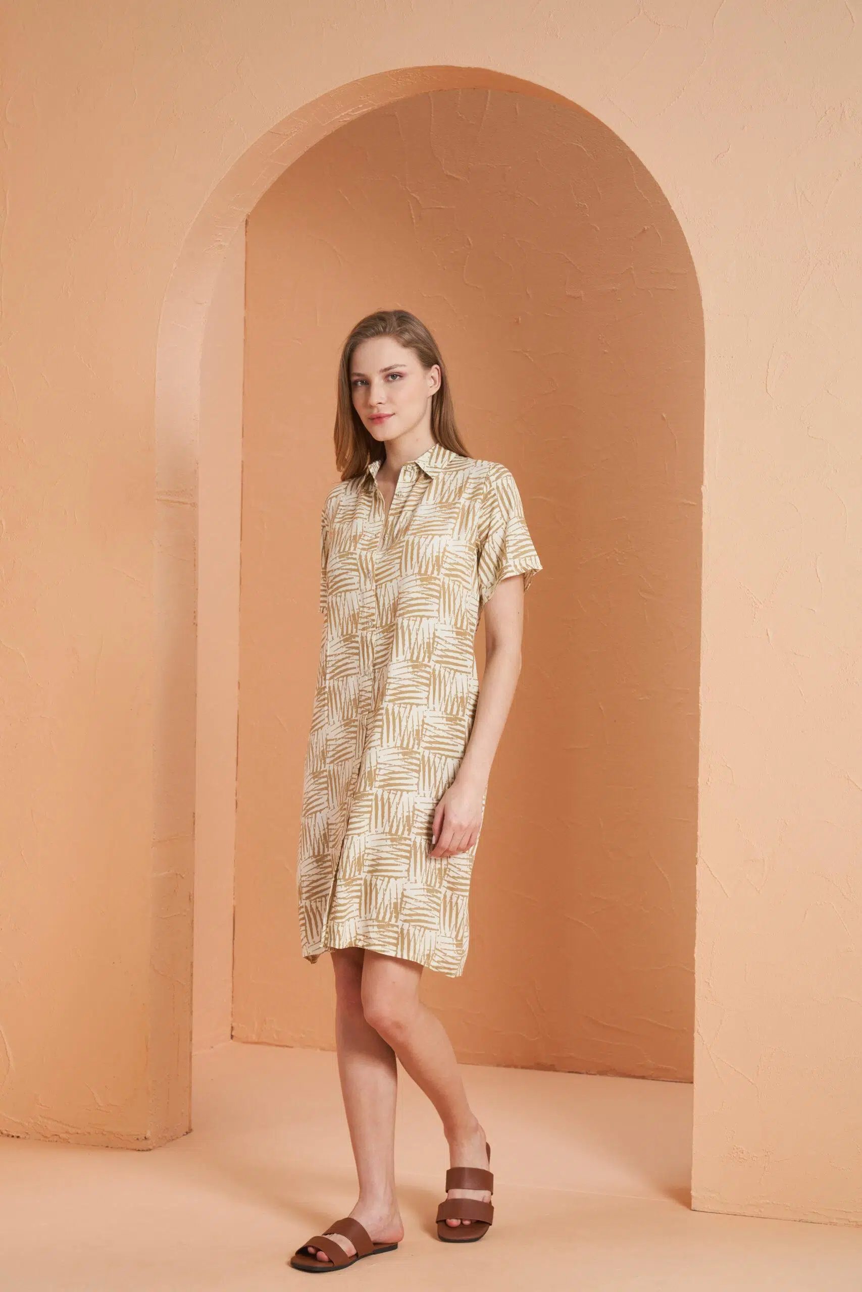 Pjs 27141 Kadın Bej Desenli Gömlek Yaka Kısa Kol Viskon Elbise