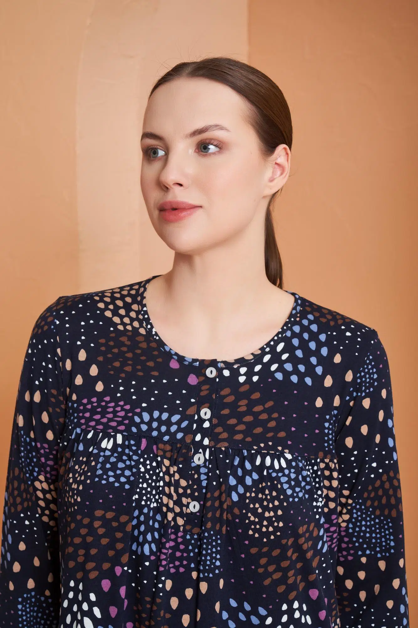 Pjs 27164 Kadın Desenli Yuvarlak Düğmeli Yaka Uzun Kollu Gecelik