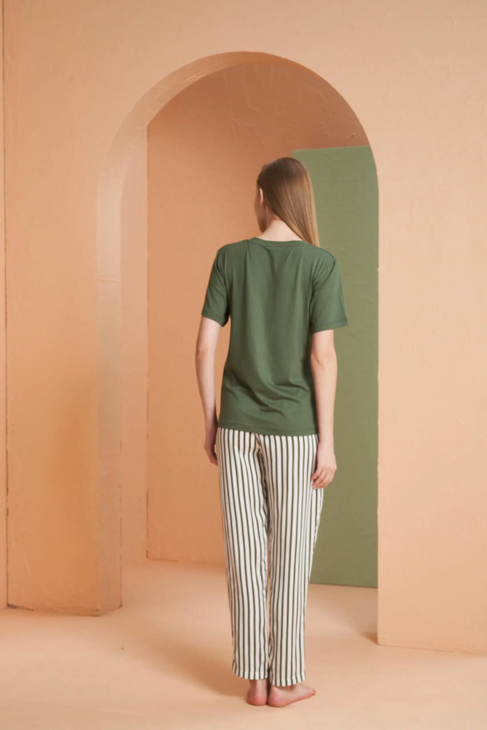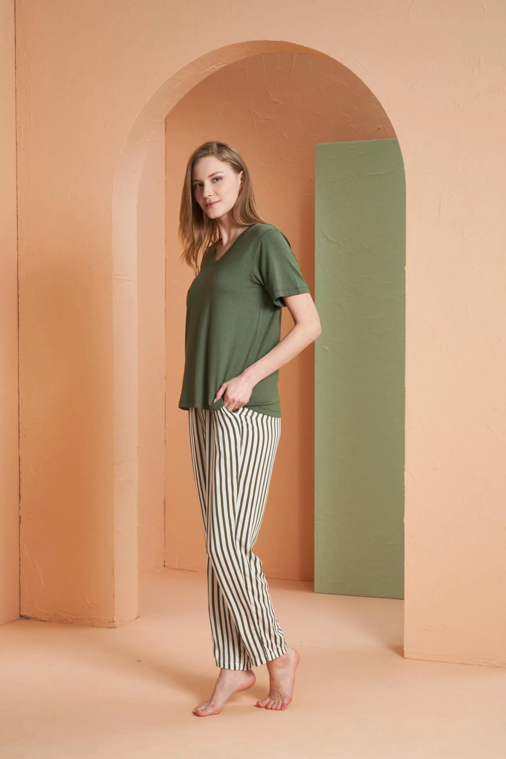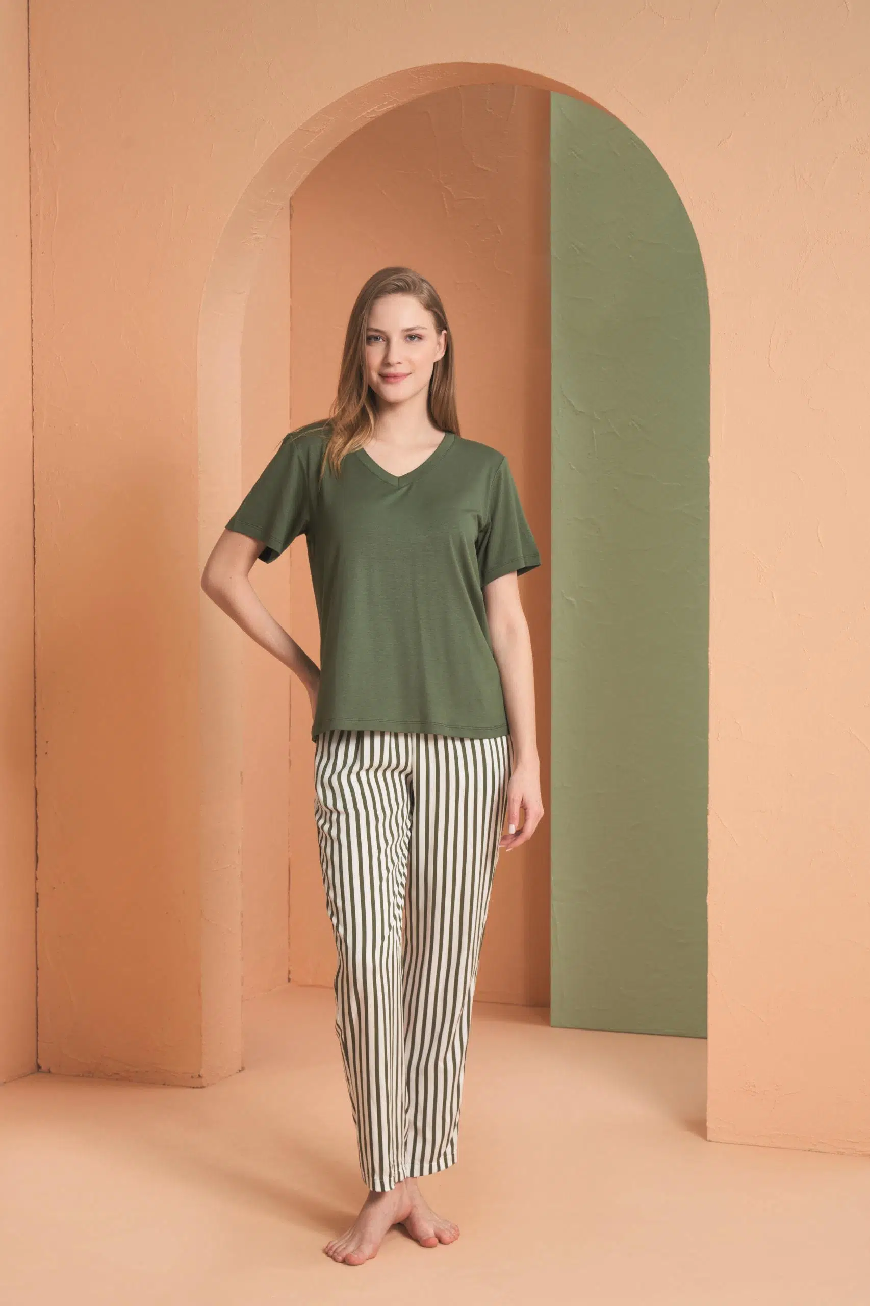 Pjs 27127 Kadın V Yaka Yarım Kollu Çizgili Pijama Takım