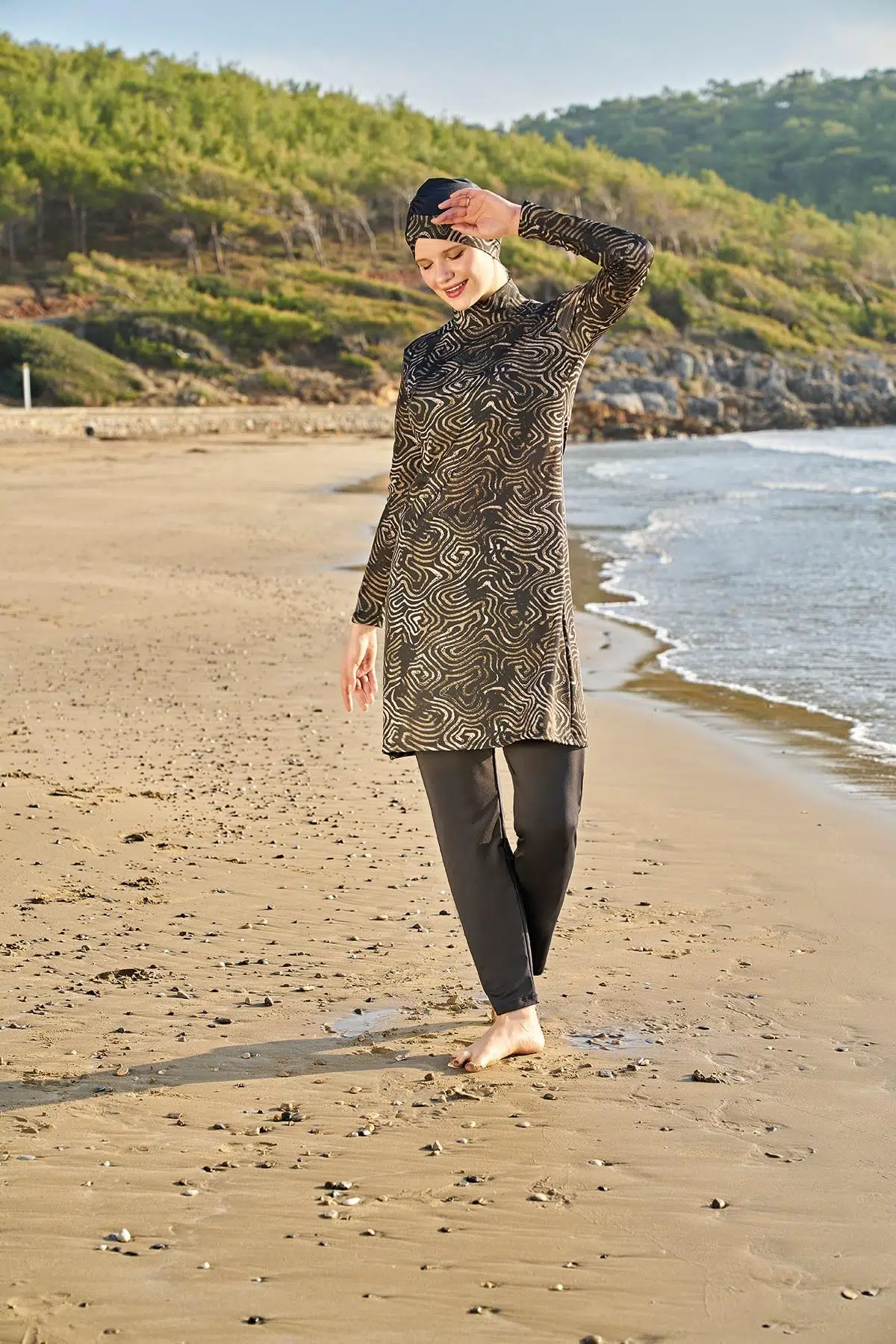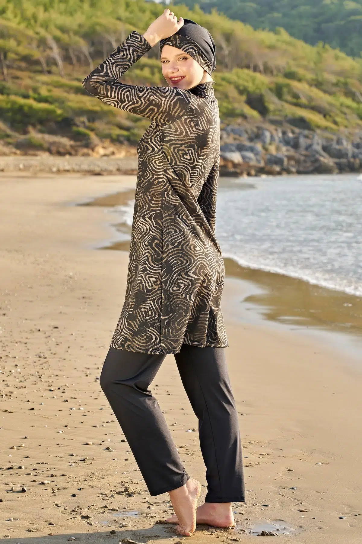 Ruko Maio 23130-1 Kadın Büyük Beden Çift Boneli Balıkçı Yaka Lycra Kumaş Tam Tesettür Mayo