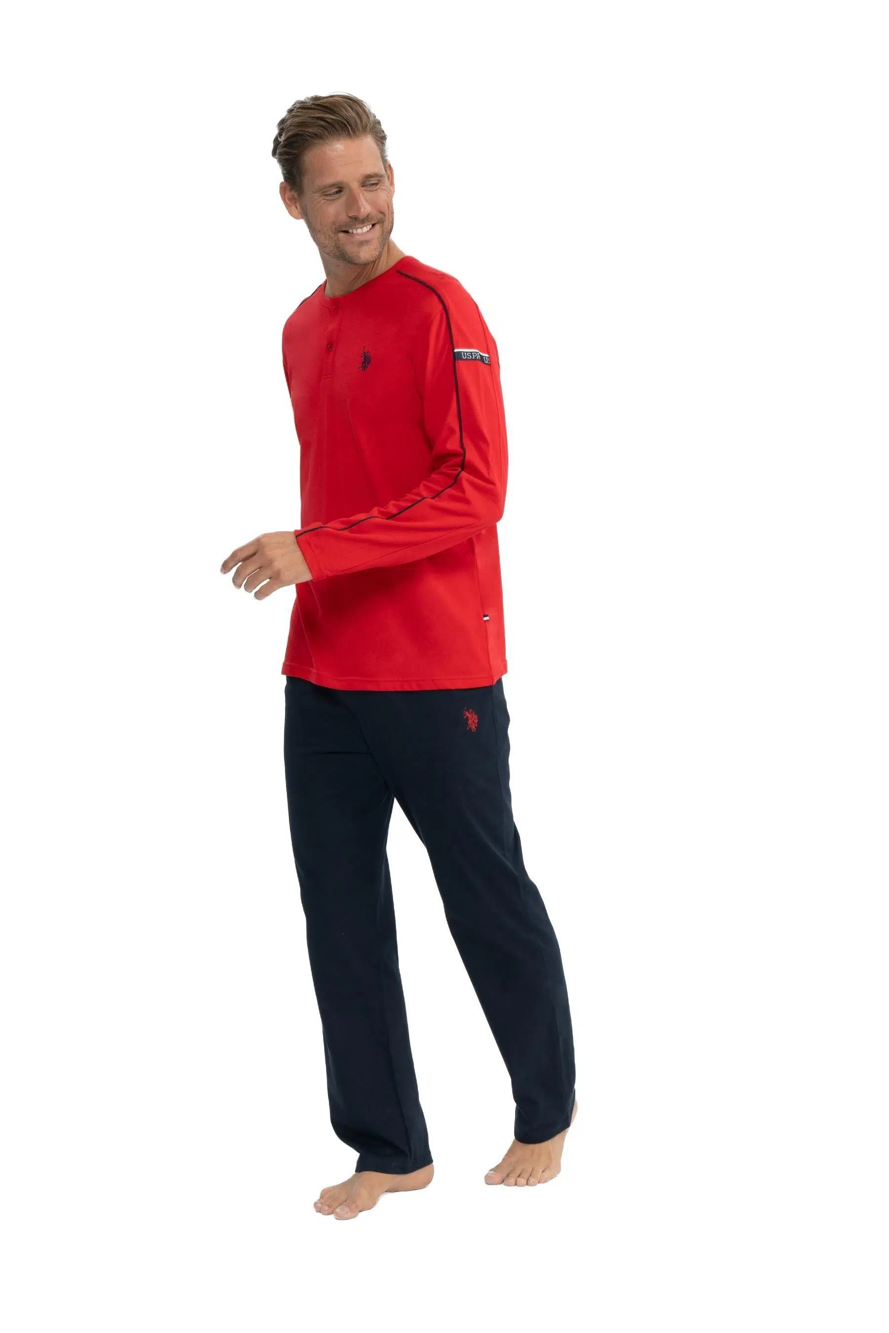 | Etiketler | U.S. Polo Assn. Erkek Kırmızı Patlı Düğmeli Şeritli Uzun Kol Pijama Takım |
